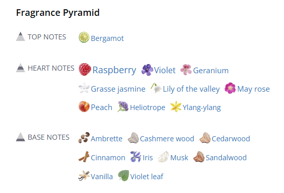 | رایحه میانی | بنفشه, تمشک, زنبق دره, شمعدانی, گل آفتابپرست, گل رز, هلو, یاس چمنی, یلانگ یلانگ |