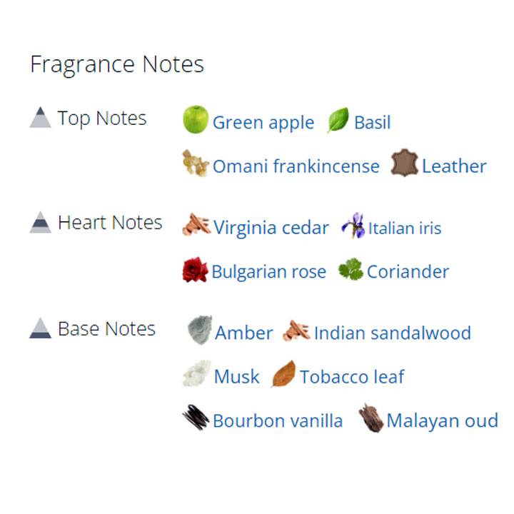 برچسب ها: برگ تنباکو, چرم, چوب صندل سفید, رز, ریحان, زنبق, سدر, سیب سبز, صمغ کندر, عنبر, عود مالایایی, گشنیز, مشک, وانیل