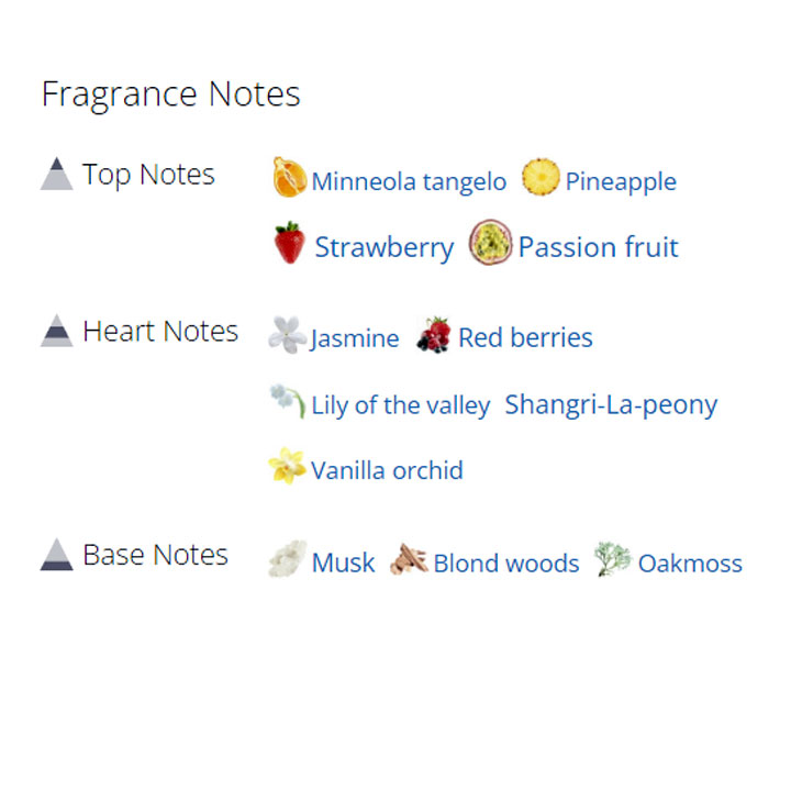 رایحه میانی: گل صدتومانی، ارکیده وانیلی، توتهای قرمز، یاس و زنبق دره، قلبی لطیف و زنانه به این عطر میبخشند که حالتی گلی و رمانتیک دارد.