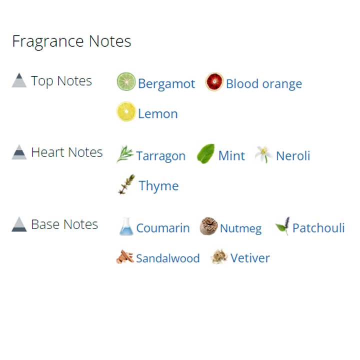 این عطر با ترنج تازه و علف لیمو به قلب گیاهی آویشن، ترخون و نعناع منتهی میشود و رایحهای واقعاً منحصربهفرد را به عطر میبخشد.
