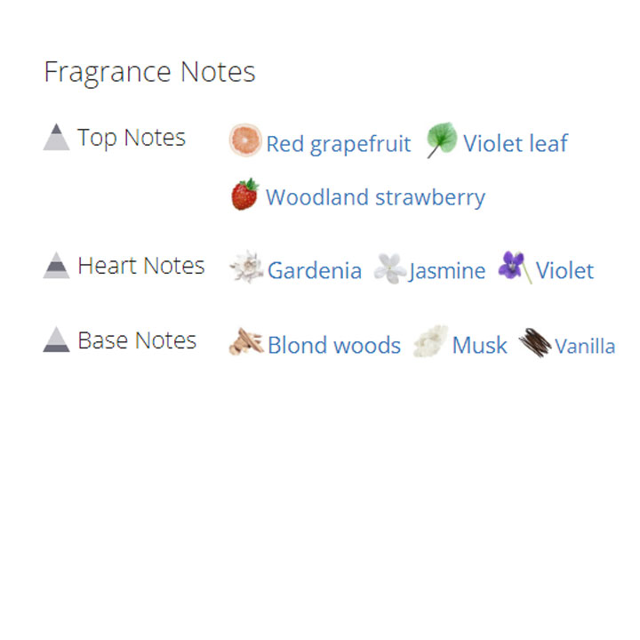 برچسب ها: برگ بنفشه, بنفشه, توت فرنگی, روایح چوبی, گاردنیای یاسمنی, گریپ فروت, مشک, وانیل, یاس