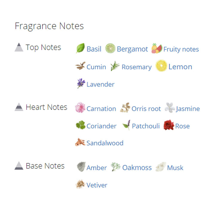 | رایحه میانی | پونه کوهی, چوب صندل سفید, رز, گشنیز, میخک صدپر, نعناع هندی, یاس |