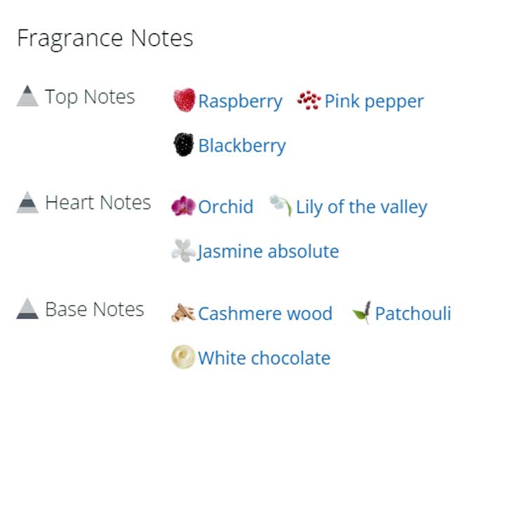 نتهای پایانی شامل چوب کشمیر، شکلات سفید و نعناع هندی هستند که عطری ماندگار و لوکس روی پوست ایجاد میکنند. این پایه گرم و کمی شیرین باعث میشود حضور شما در ذهن اطرافیان به یاد ماندنی باشد و عطری با امضای خاص زنانه خلق شود.