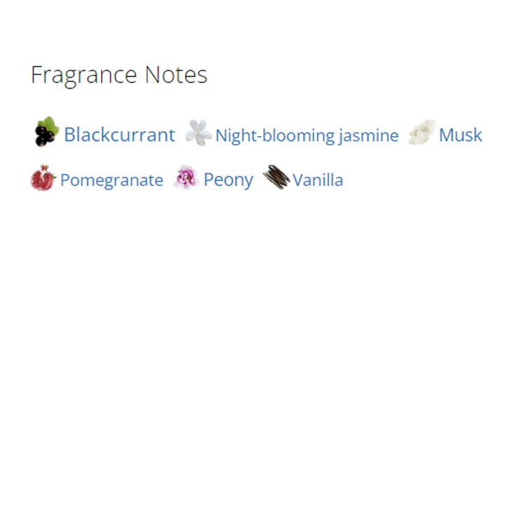 - نت های رایحه: توت سیاه، انار، یاس، گل صد تومانی، وانیل و مشک سفید.