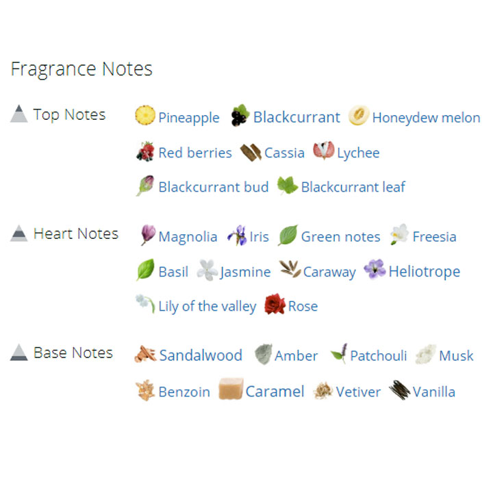 | رایحه پایدار | چوب صندل سفید, خس خس, کارامل, کهربا, لوبان, مشک, نعناع هندی, وانیل |