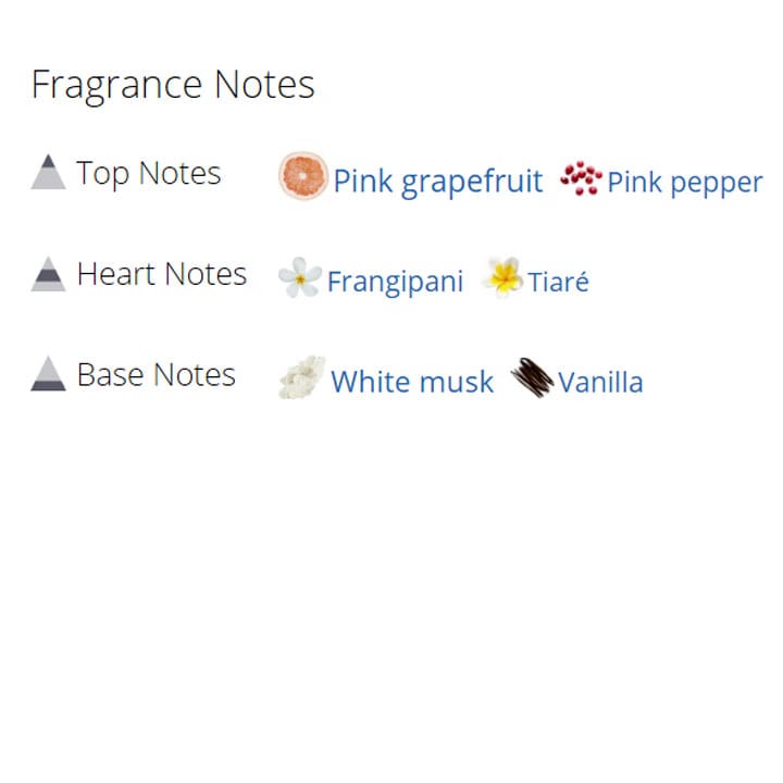 | رایحه میانی | Frangipani (یک نت میوه ای گرمسیری از گل با ته رنگ مرکبات), Tiaré (یک نت گل سفید، خامه ای، میوه ای و گل هندوانه) |