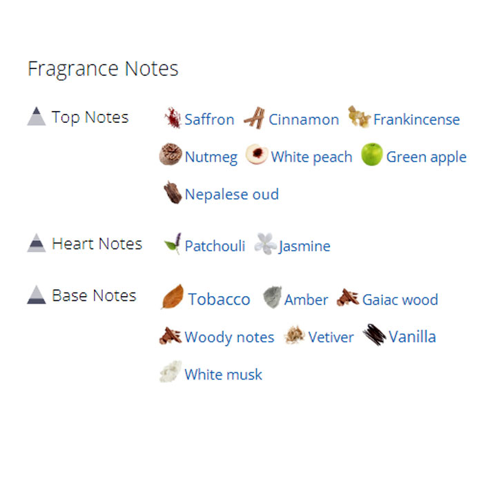 برچسب ها: تنباکو, جوز, چوب صندل سفید, چوب گایاک, خس خس, دارچین, زعفران, سیب, عود, کندر, کهربا, گلابی, مشک, نعناع هندی, هلو, وانیل, یاس